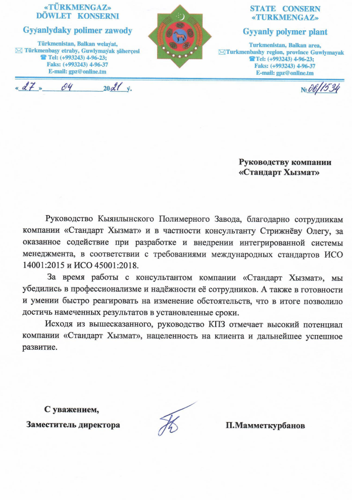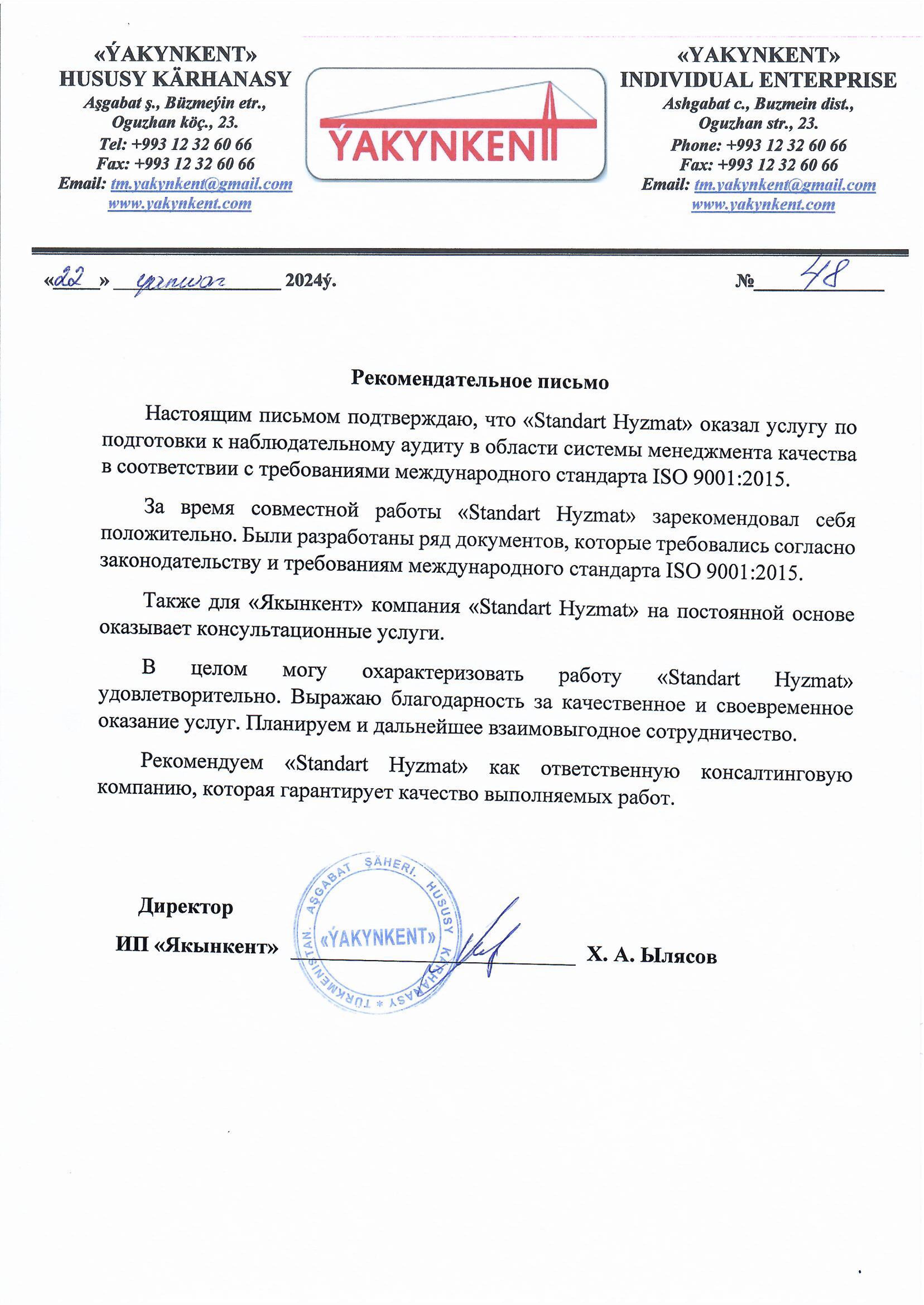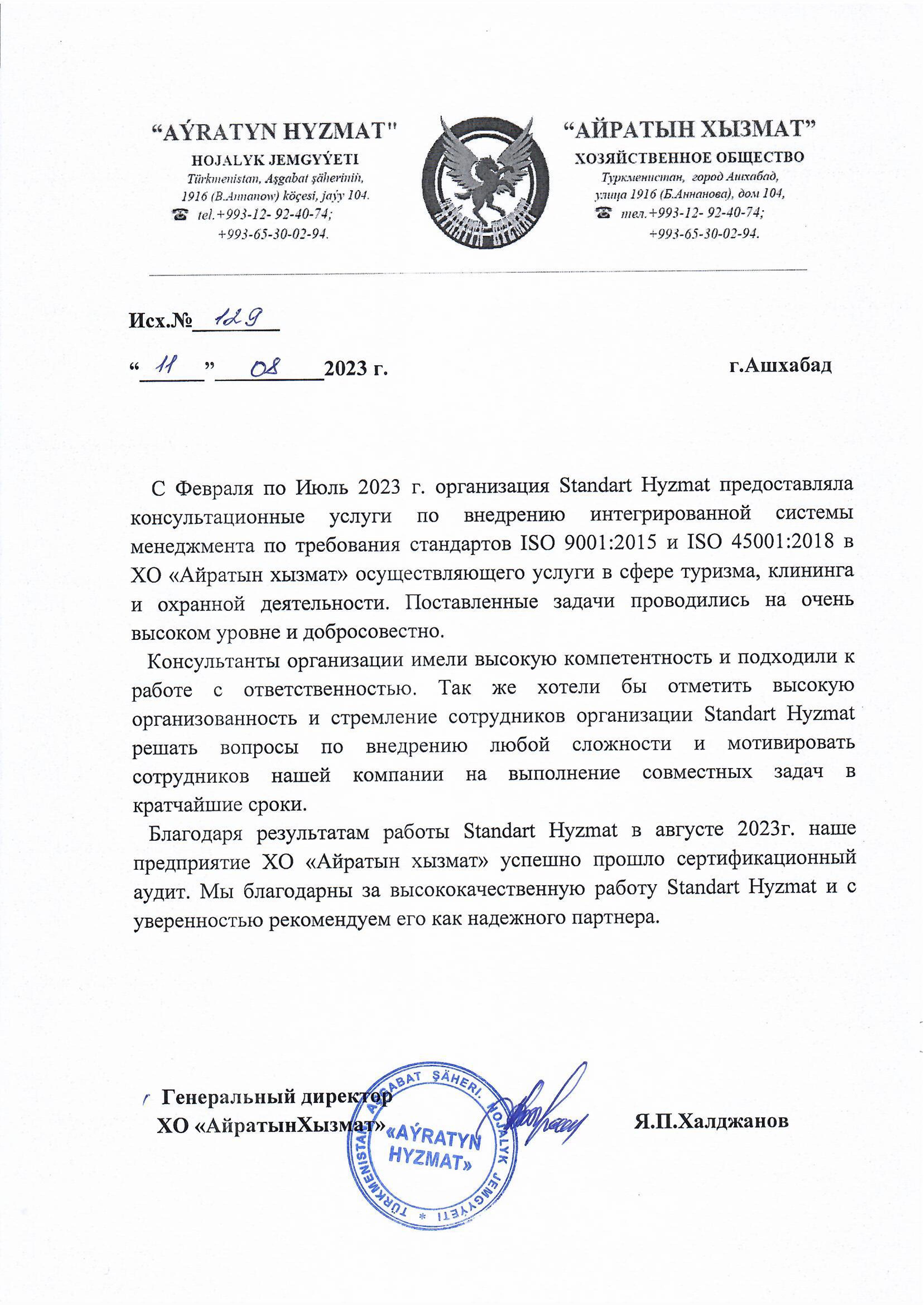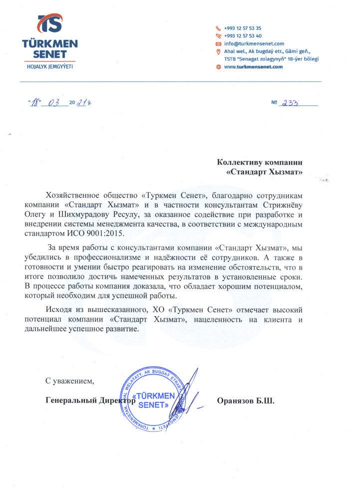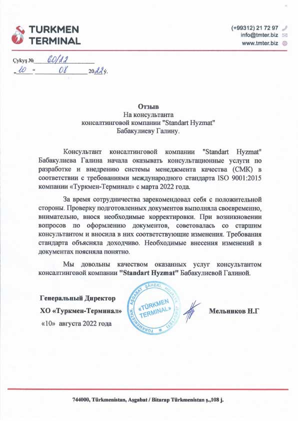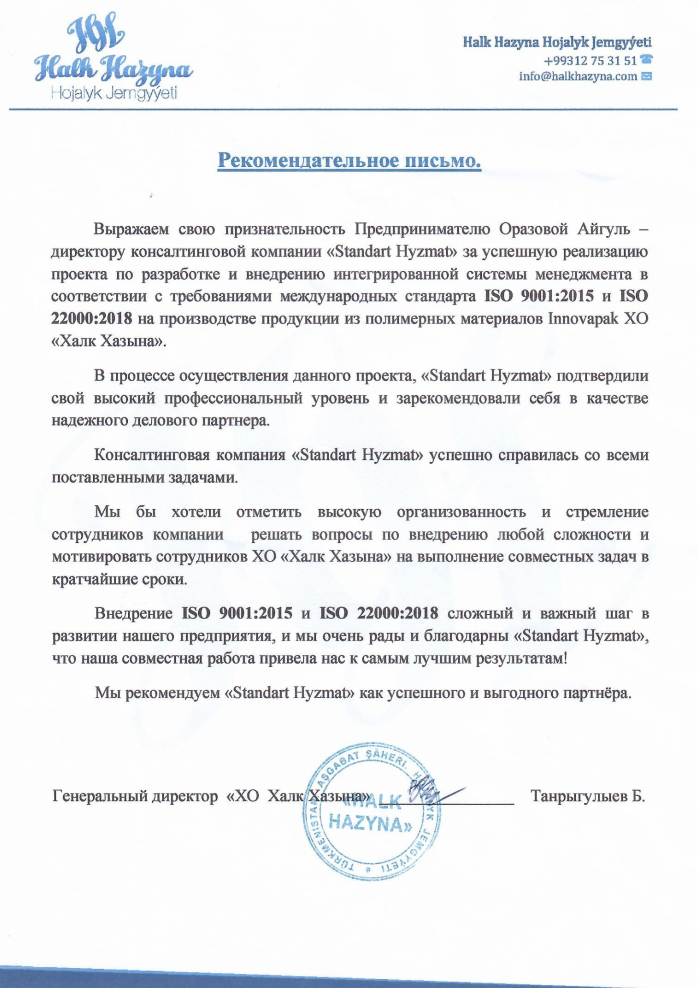 “Dowamly Hyzmat” – это команда сертифицированных специалистов в различных отраслях деятельности, оказывающия услуги по разработке и внедрению систем менеджмента в соответствии с международными стандартами. Свою деятельность “Dowamly Hyzmat” начала с 2016 года и на сегодняшний день имеет в своём активе не один десяток успешно завершённых проектов.