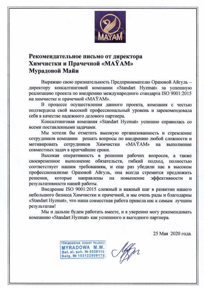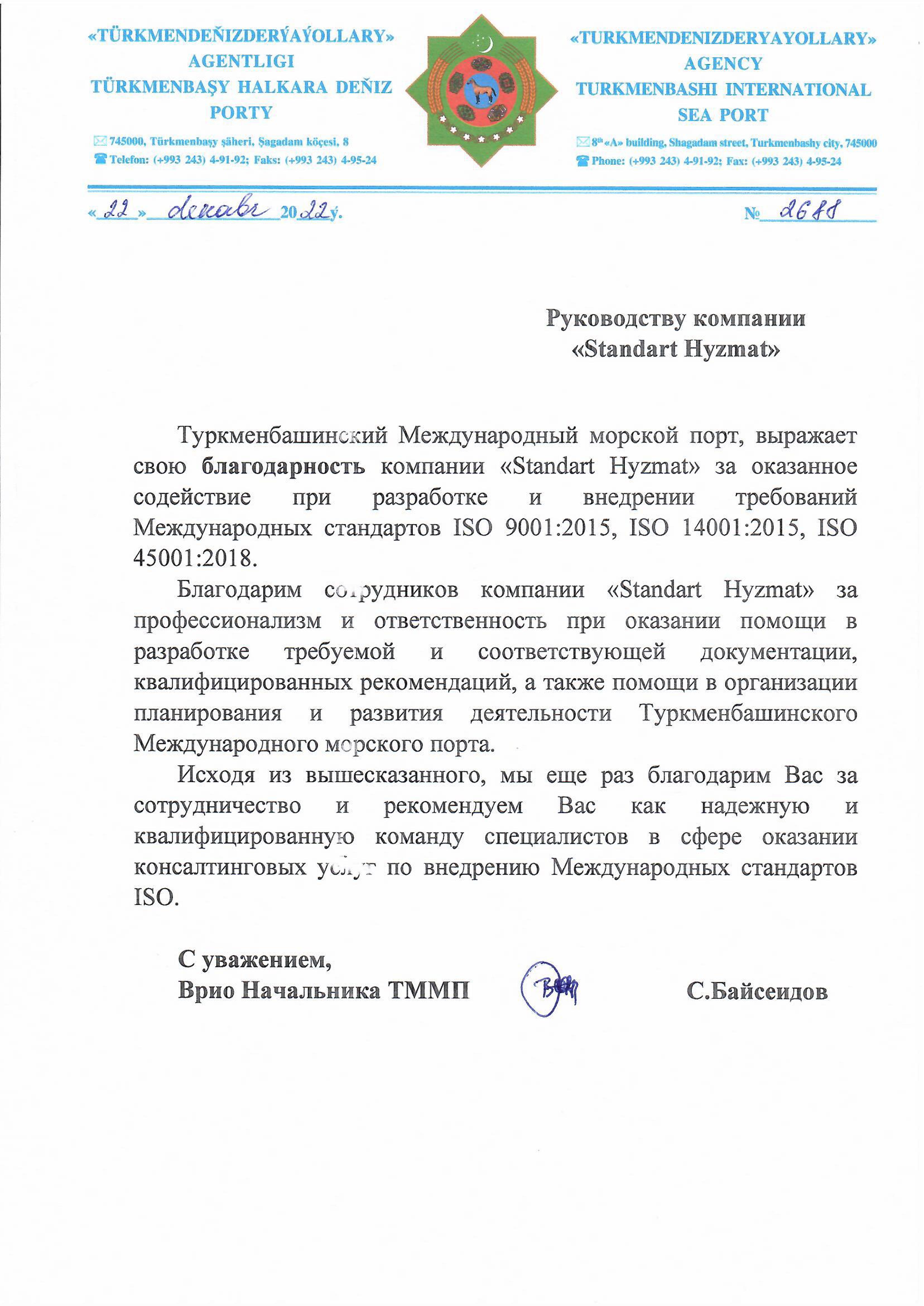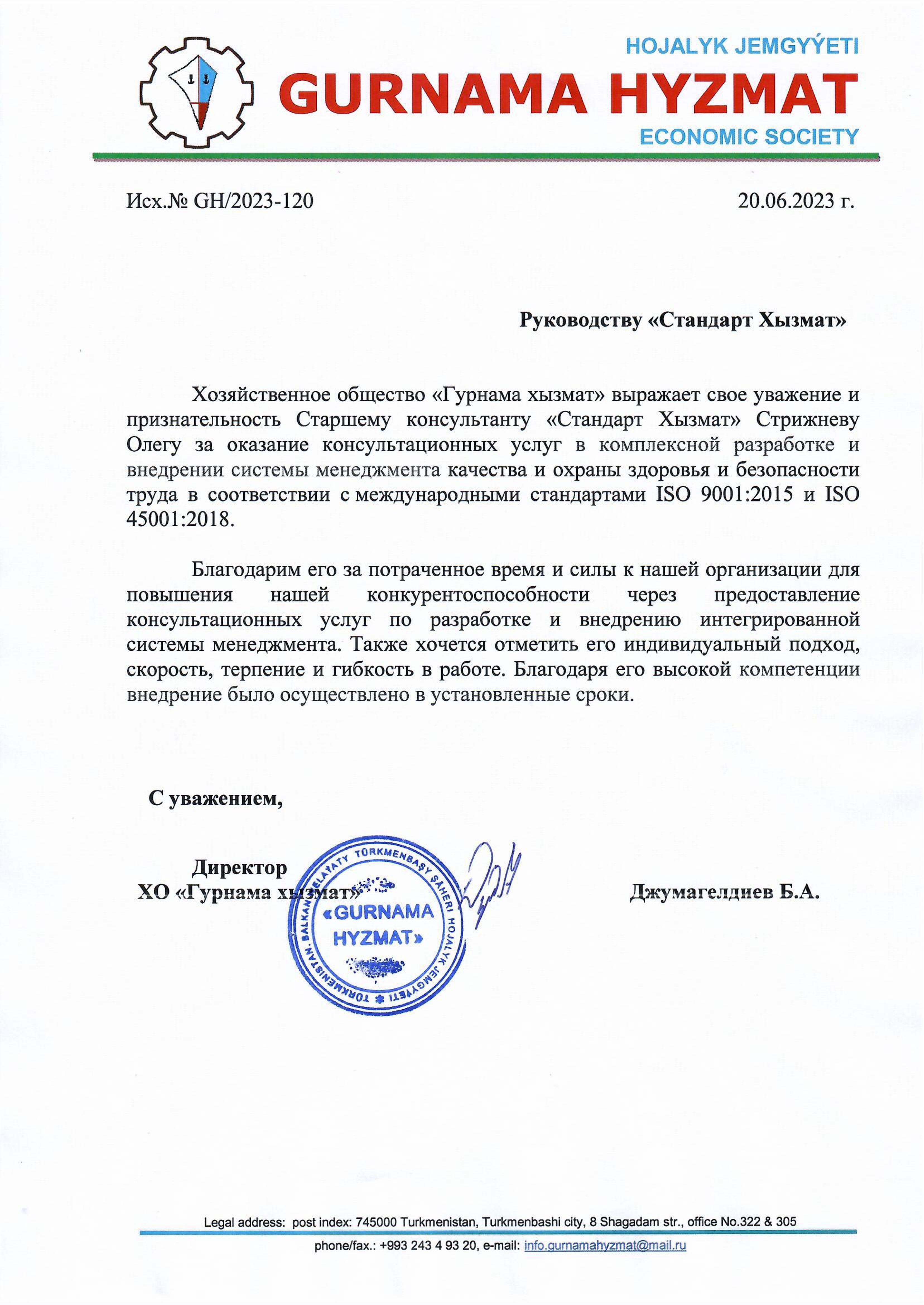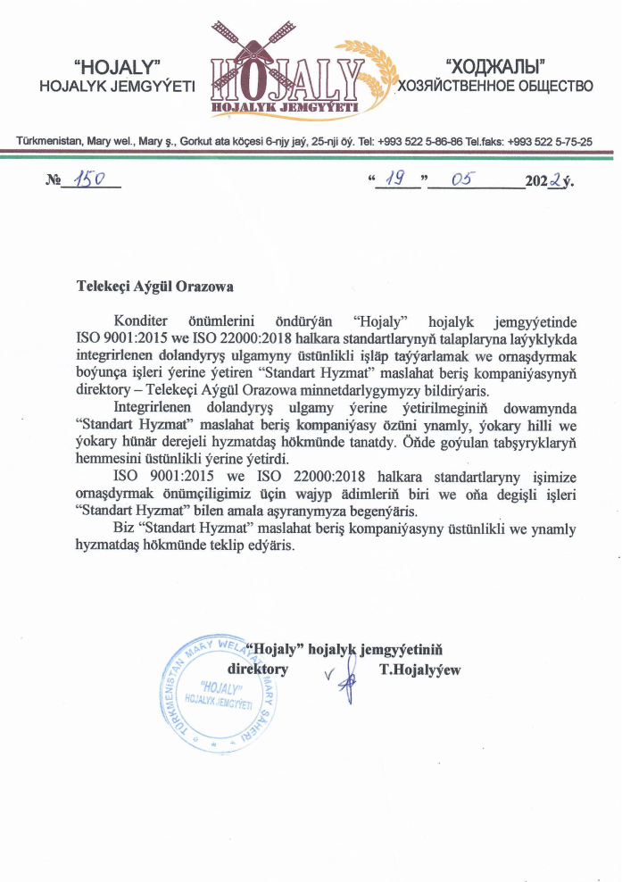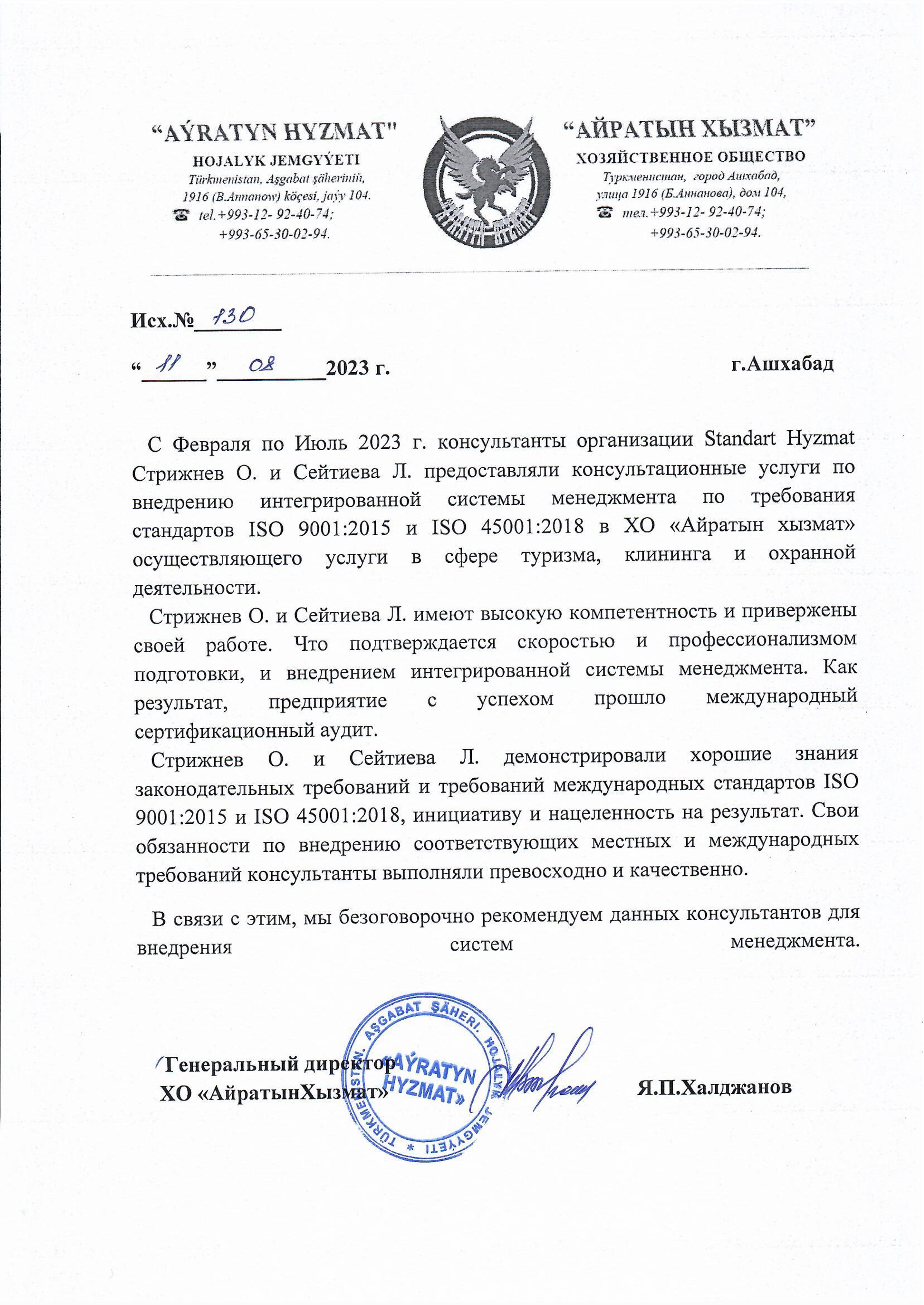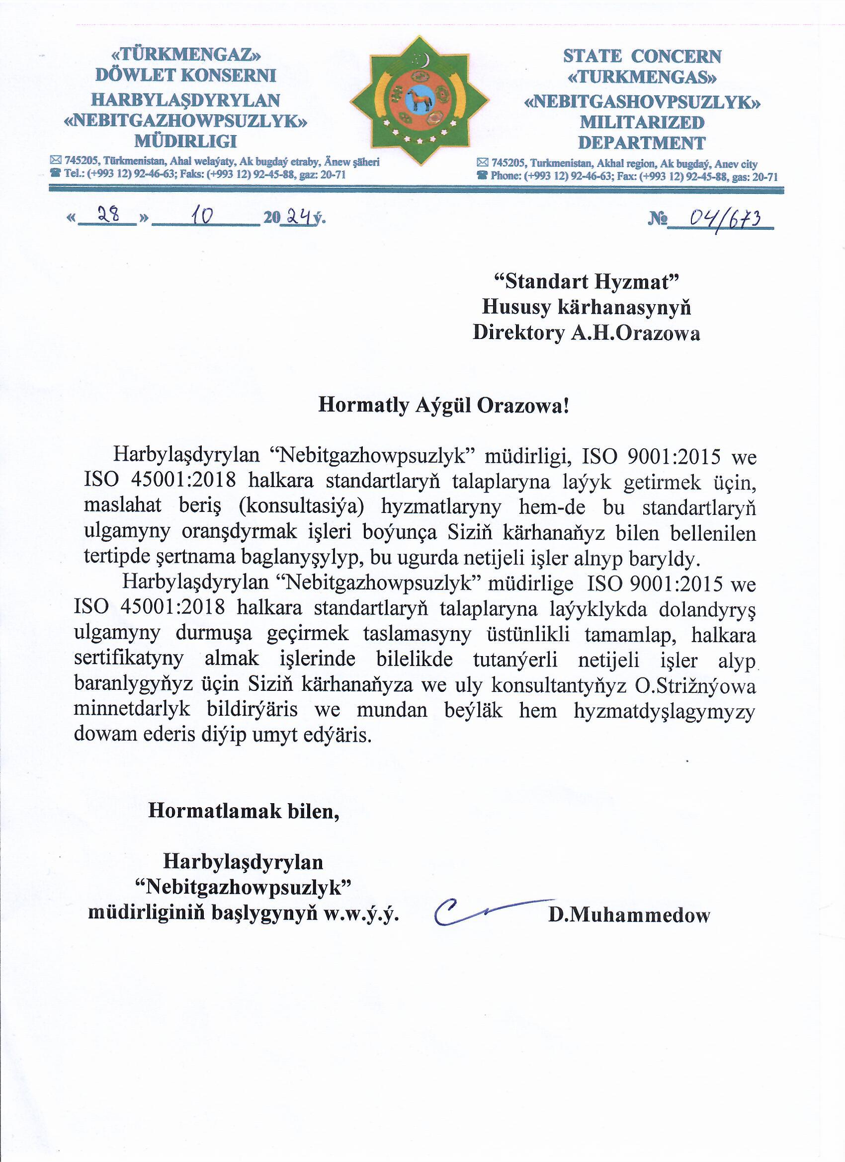 “Dowamly Hyzmat” – это команда сертифицированных специалистов в различных отраслях деятельности, оказывающия услуги по разработке и внедрению систем менеджмента в соответствии с международными стандартами. Свою деятельность “Dowamly Hyzmat” начала с 2016 года и на сегодняшний день имеет в своём активе не один десяток успешно завершённых проектов.