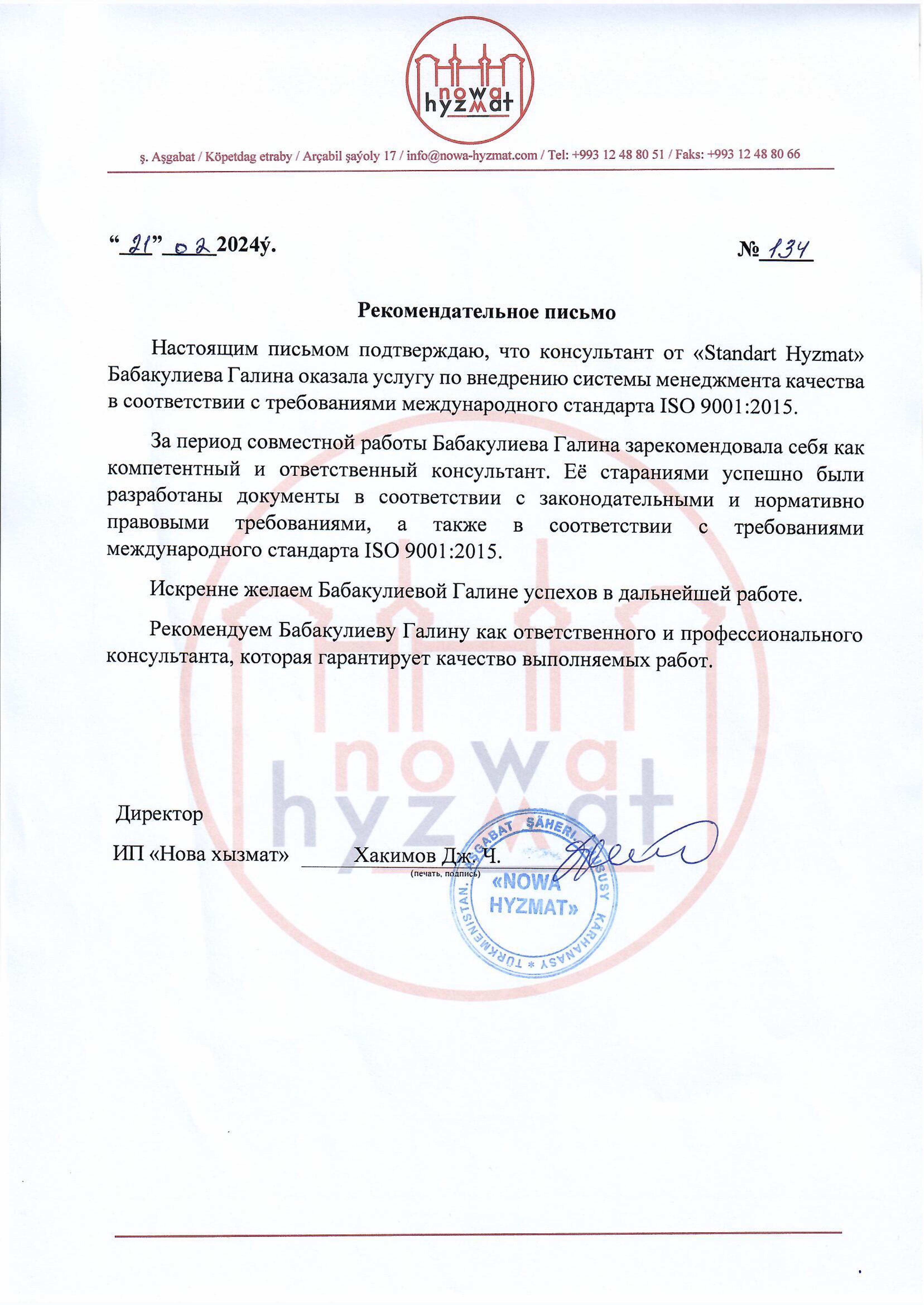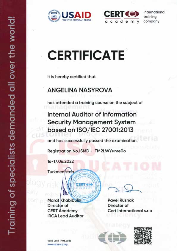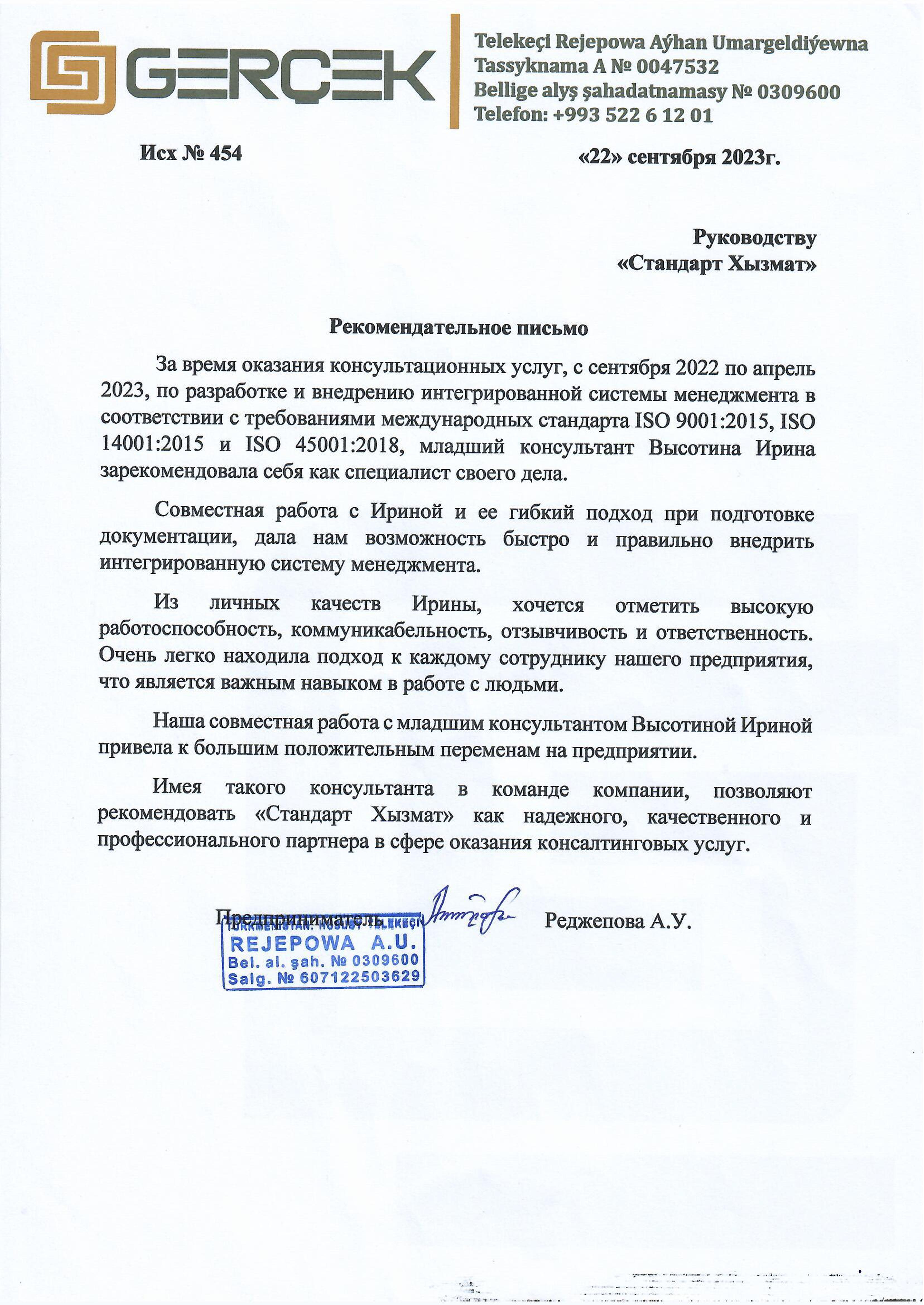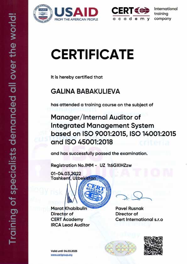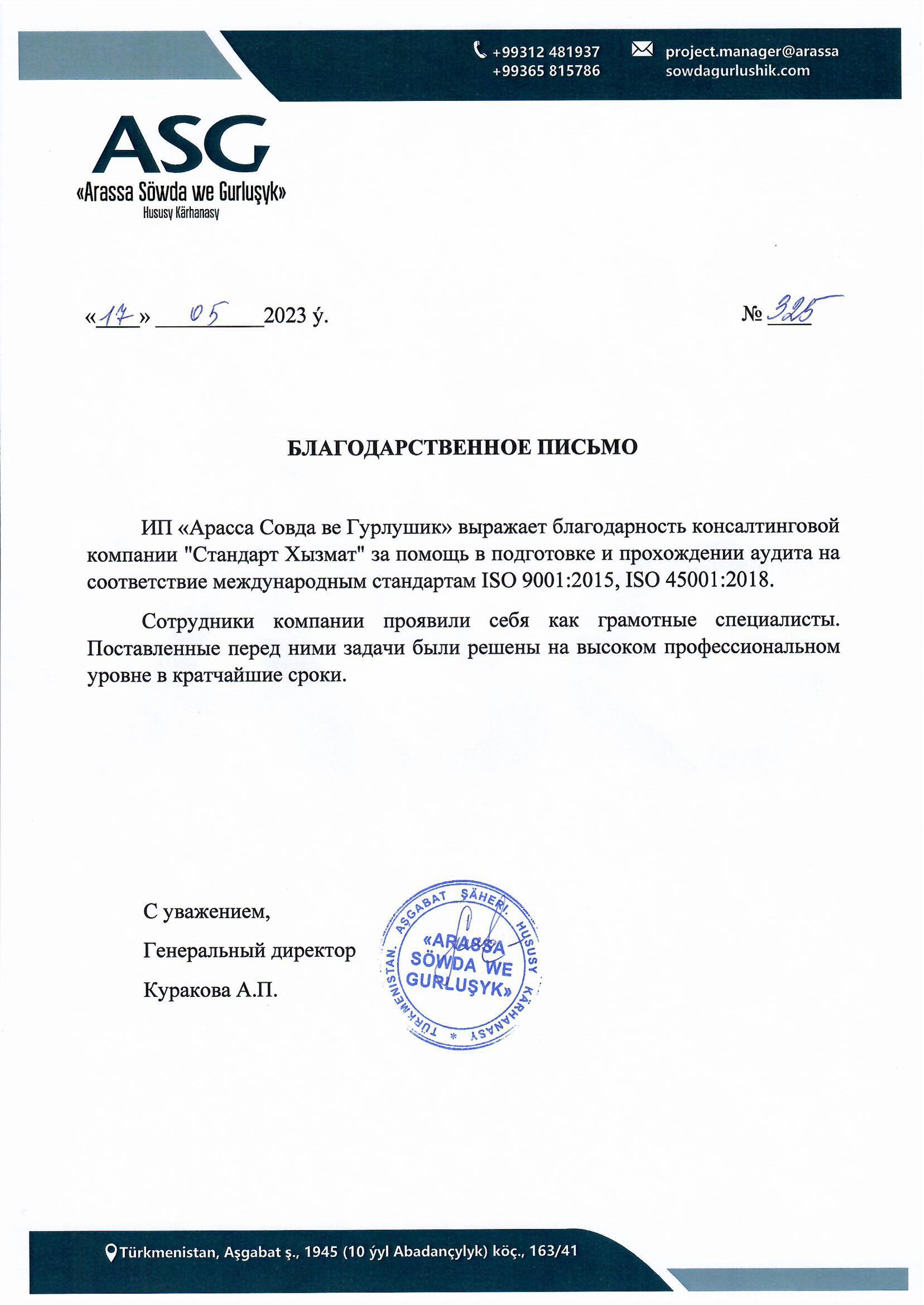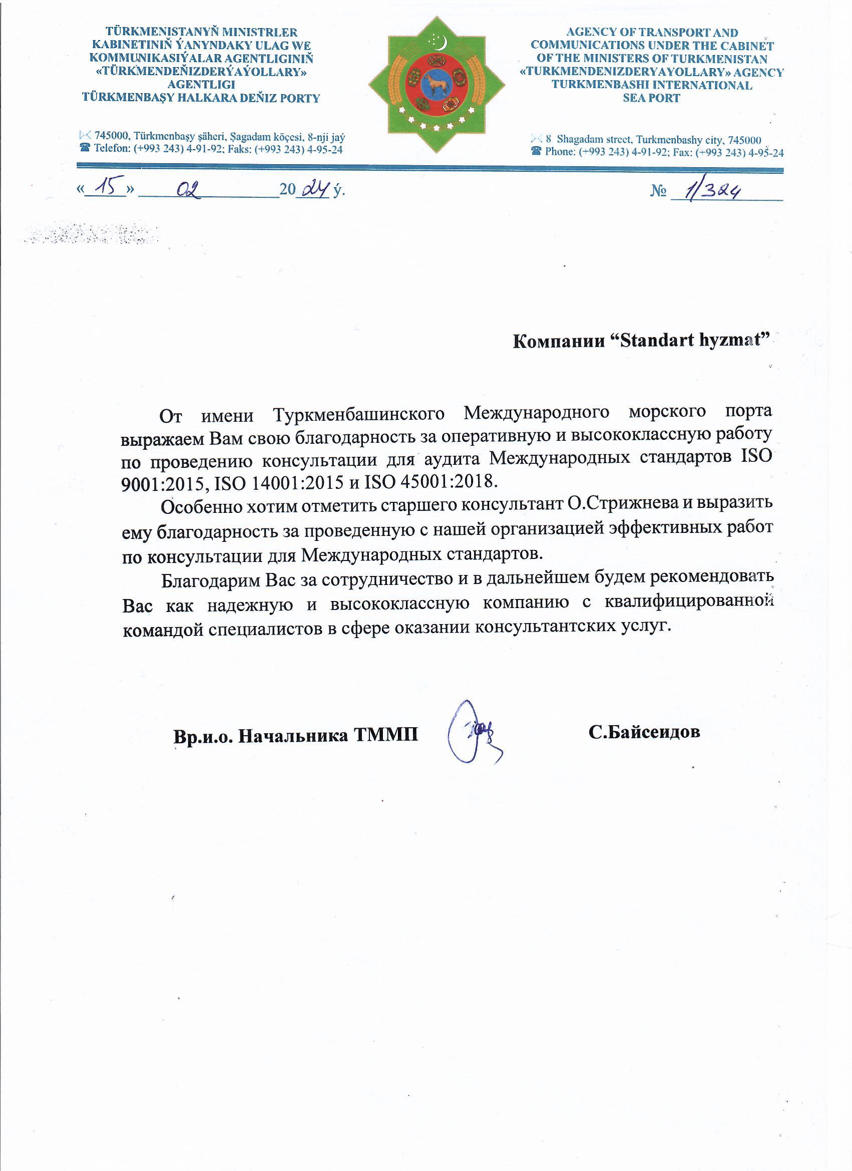 “Dowamly Hyzmat” – это команда сертифицированных специалистов в различных отраслях деятельности, оказывающия услуги по разработке и внедрению систем менеджмента в соответствии с международными стандартами. Свою деятельность “Dowamly Hyzmat” начала с 2016 года и на сегодняшний день имеет в своём активе не один десяток успешно завершённых проектов.