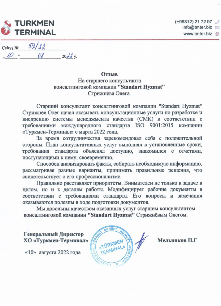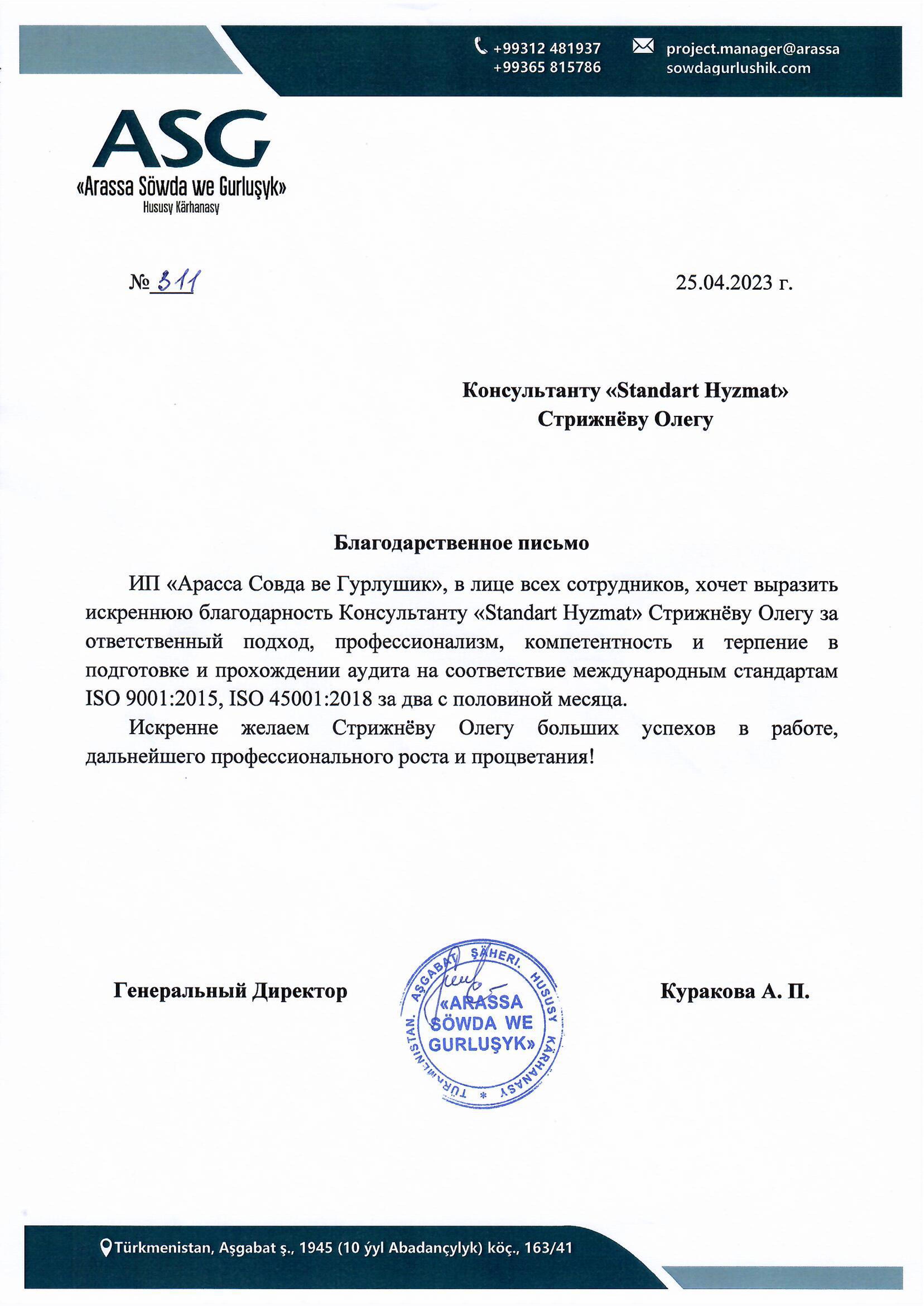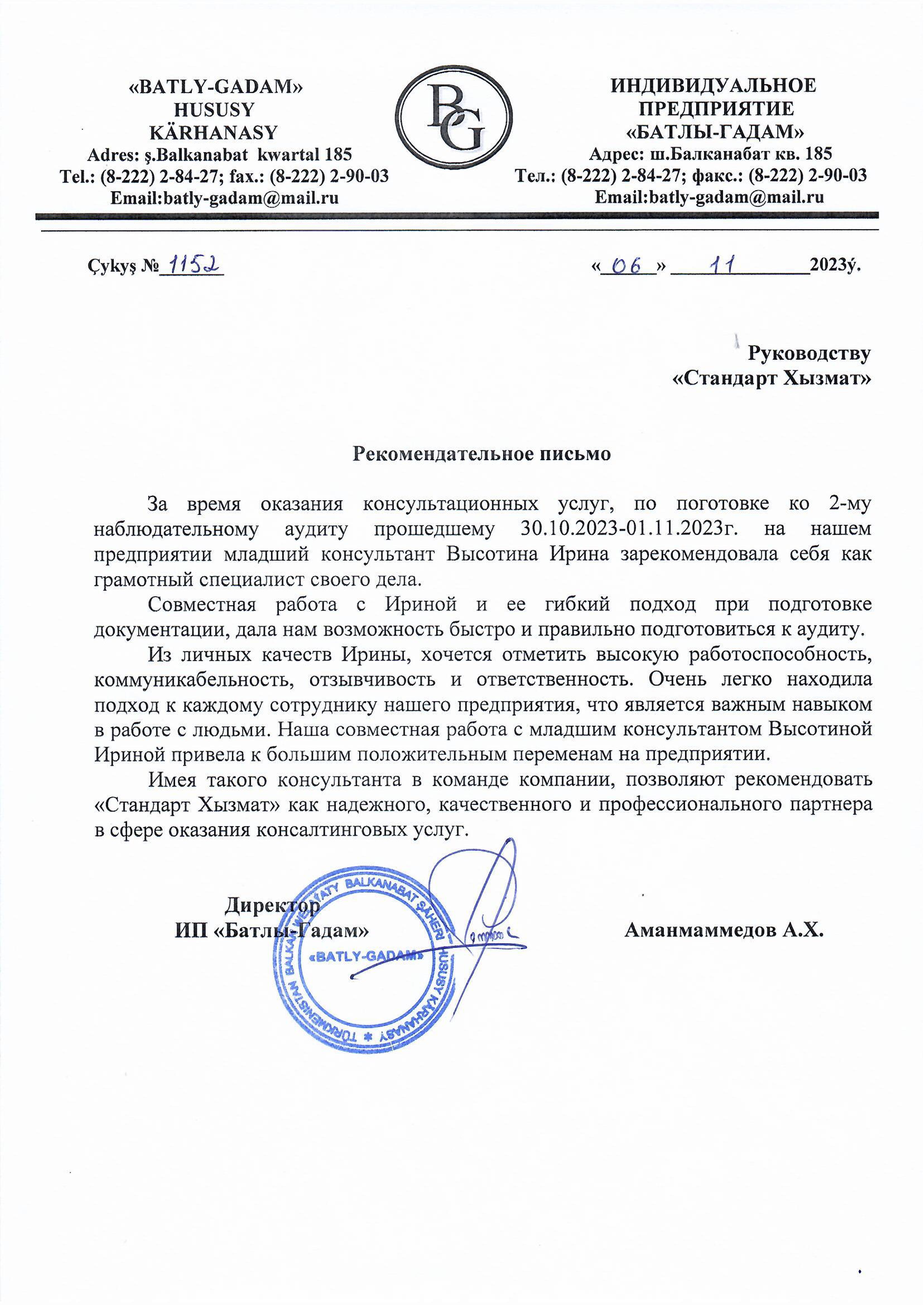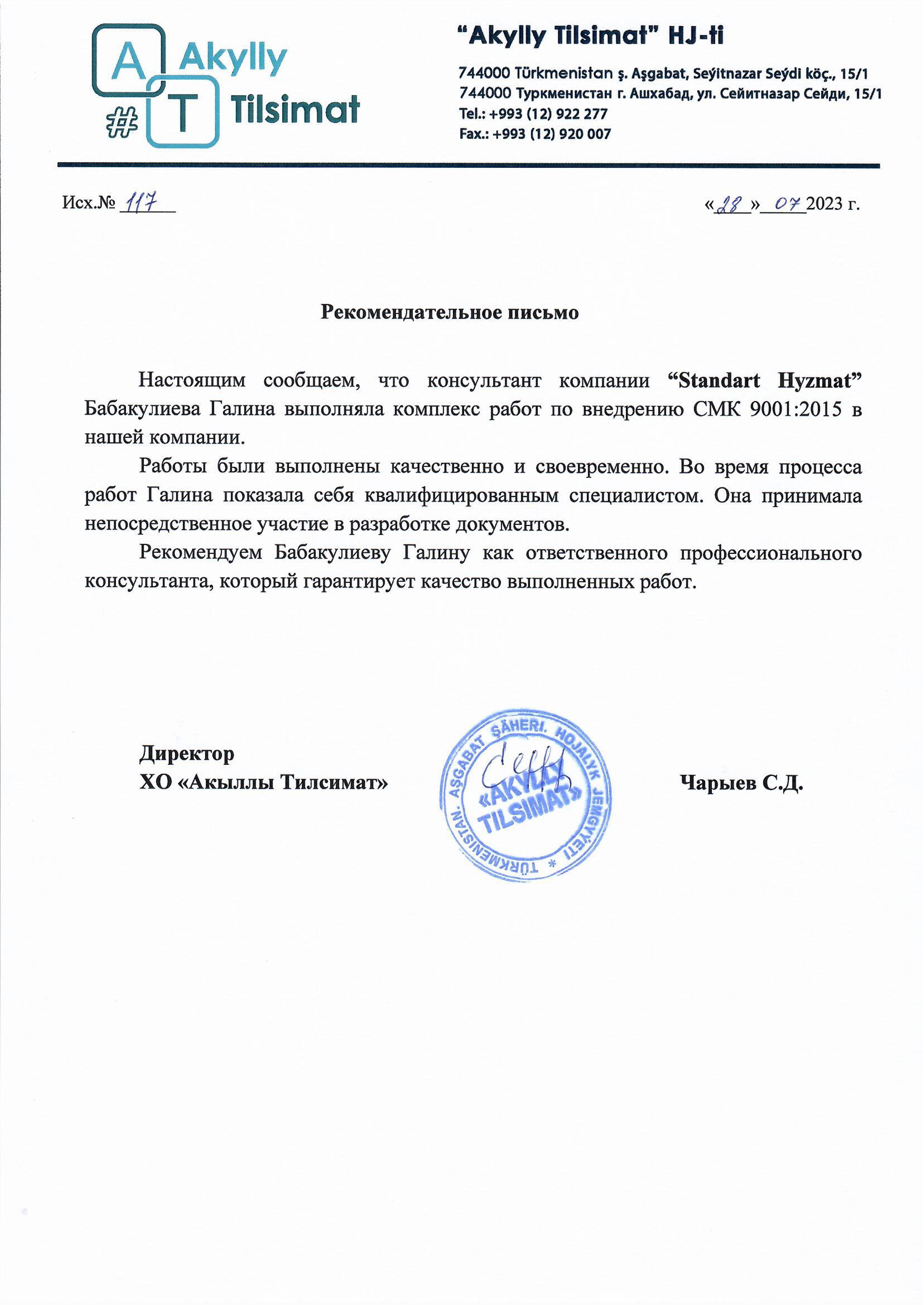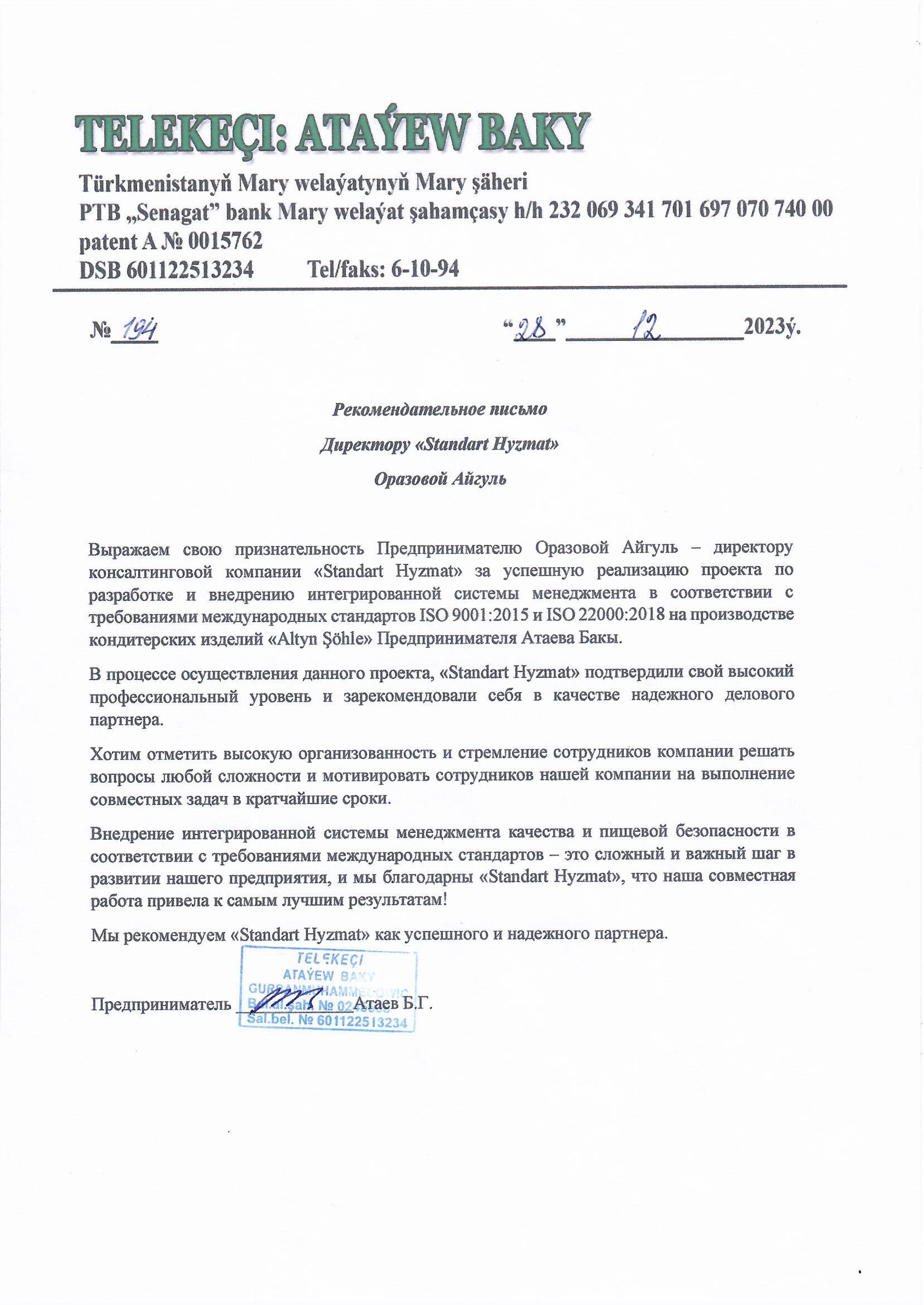 “Dowamly Hyzmat” – это команда сертифицированных специалистов в различных отраслях деятельности, оказывающия услуги по разработке и внедрению систем менеджмента в соответствии с международными стандартами. Свою деятельность “Dowamly Hyzmat” начала с 2016 года и на сегодняшний день имеет в своём активе не один десяток успешно завершённых проектов.