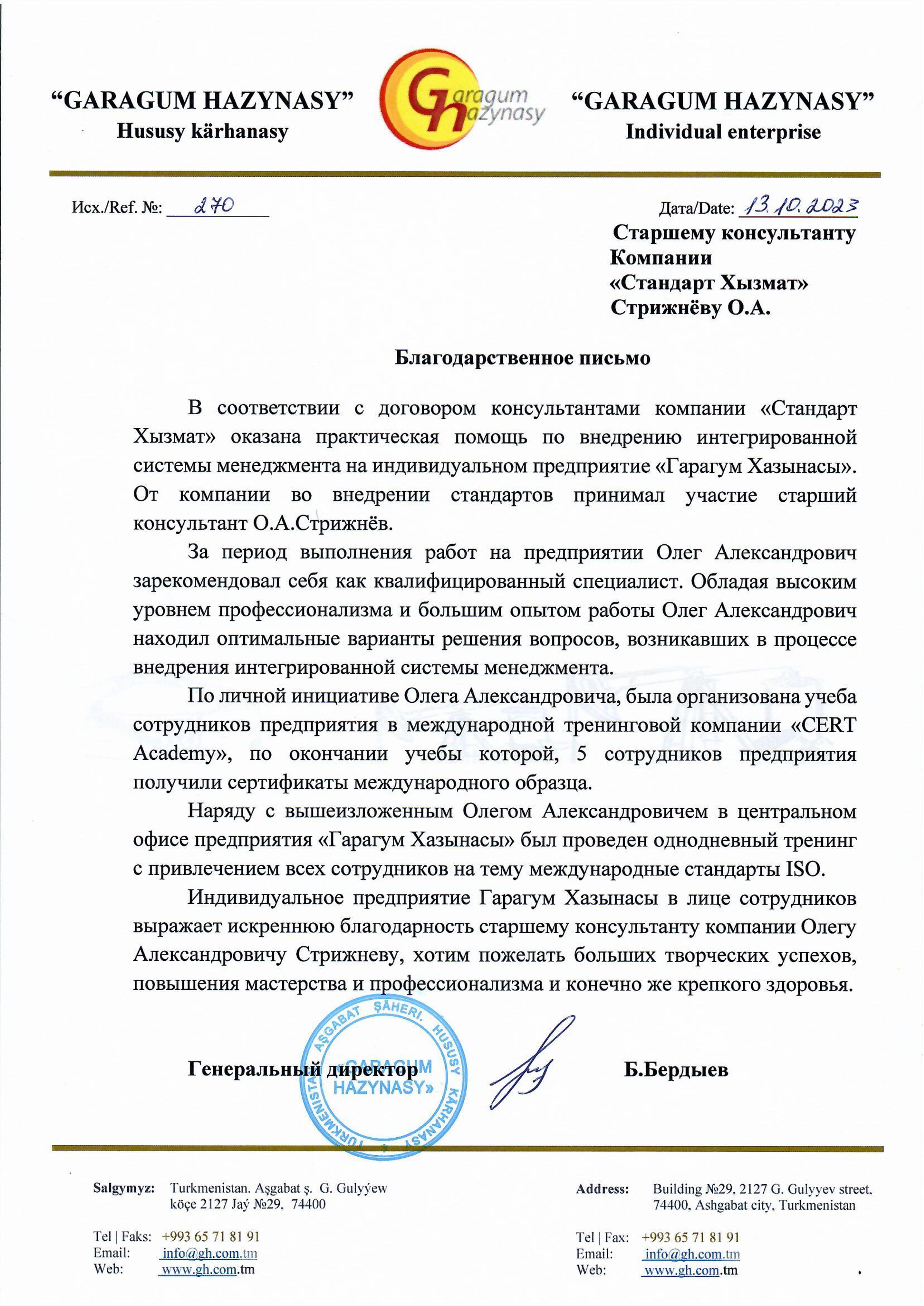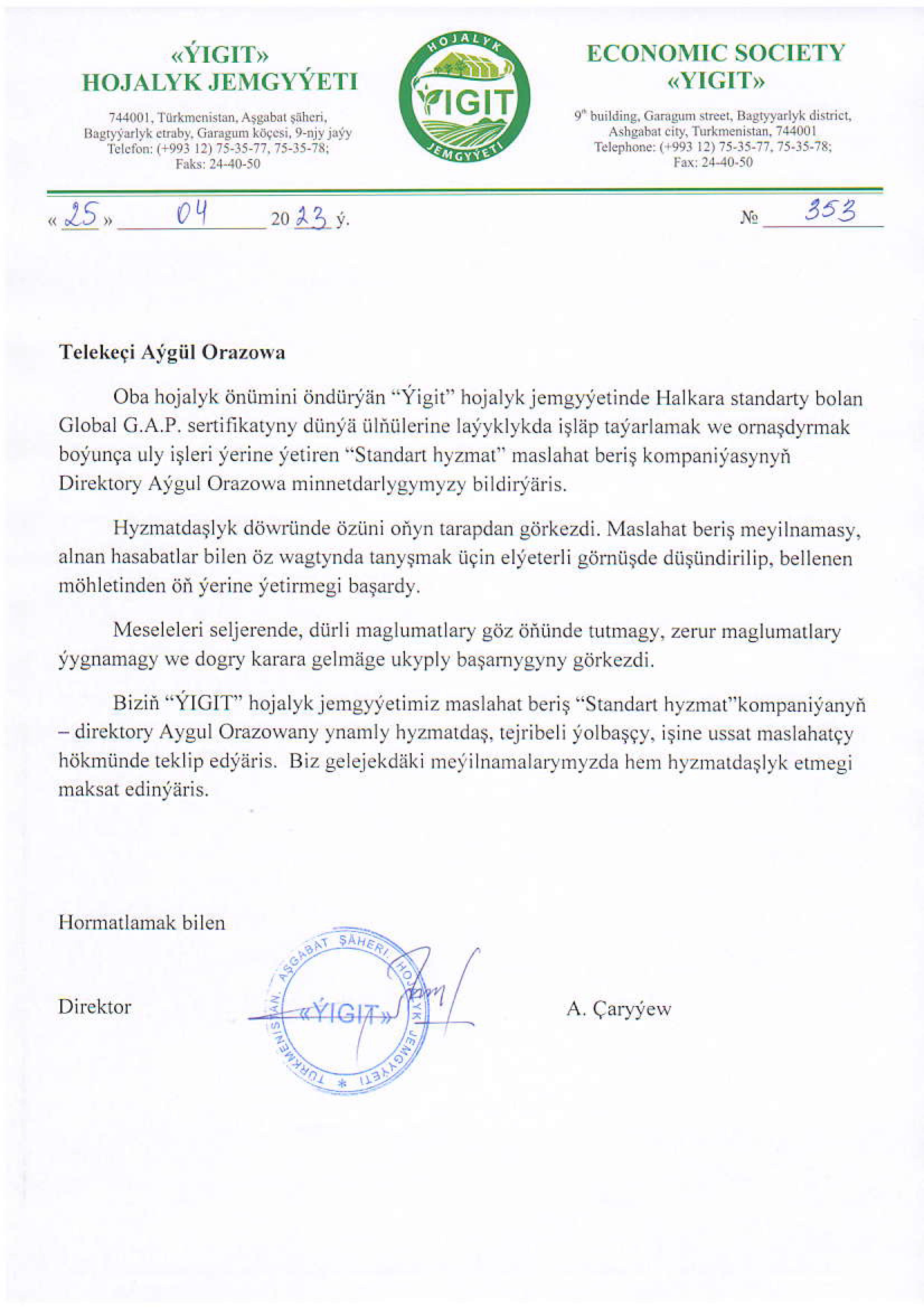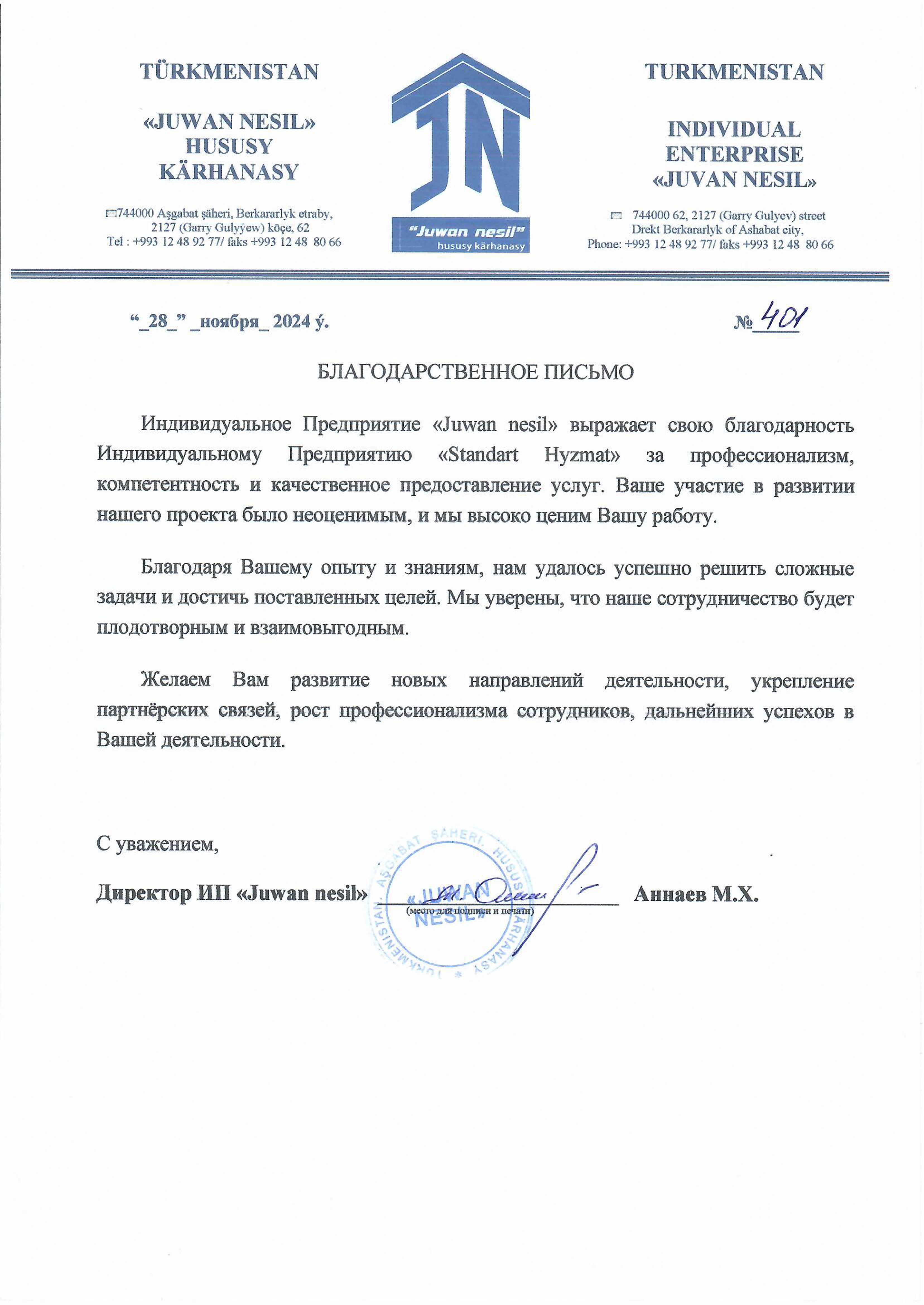Миссия “Dowamly Hyzmat” – оказание помощи предприятиям и организациям Туркменистана в достижении стратегических целей, совершенствования основных процессов деятельности и выхода на новые уровни развития.