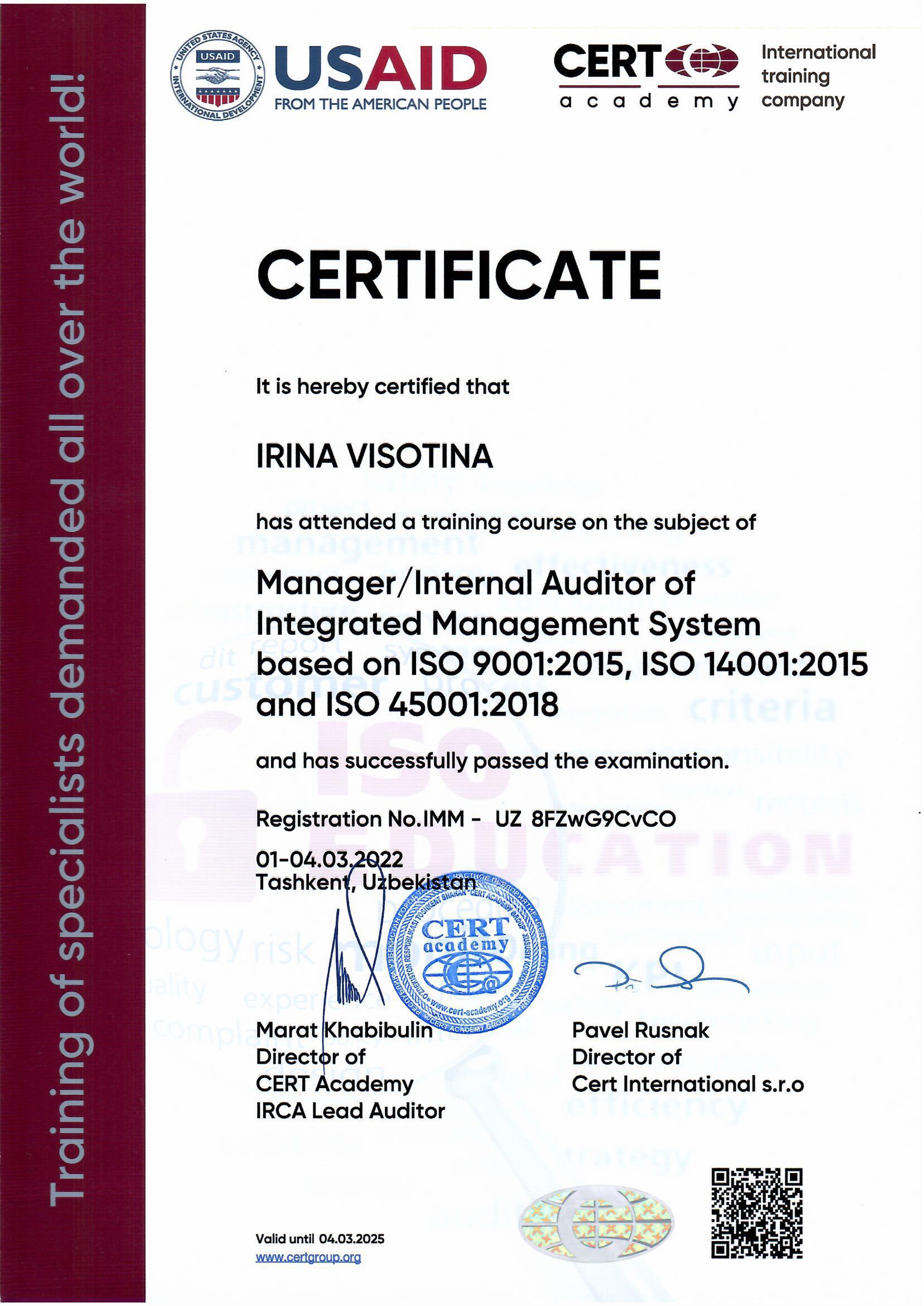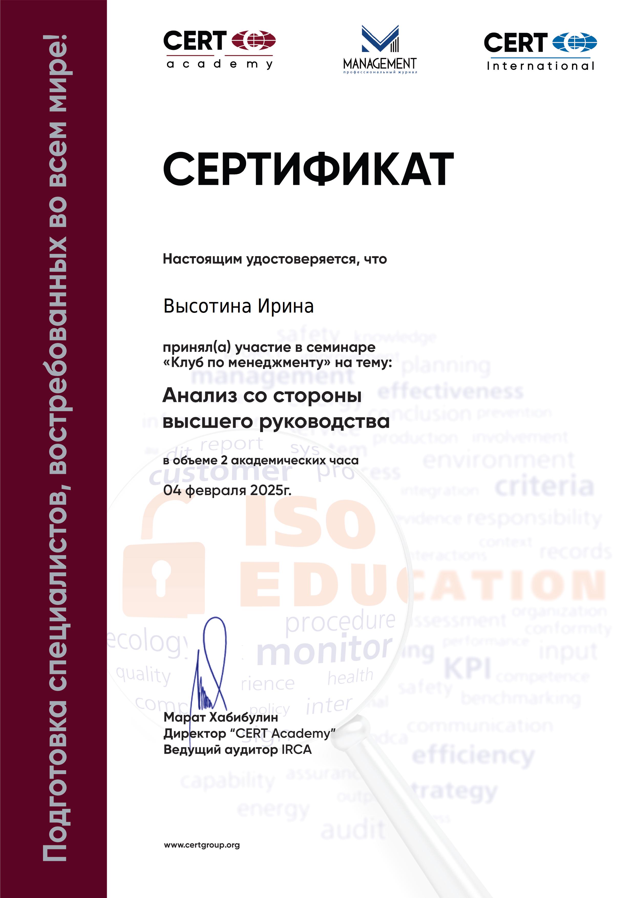 При этом мы сотрудничаем с ведущими международными органами по сертификации и можем дать рекомендации, но выбор всегда остается за Вами. Мы гарантируем, в случае выполнения наших рекомендаций, прохождение сертификации в любом выбранном Вами органе.