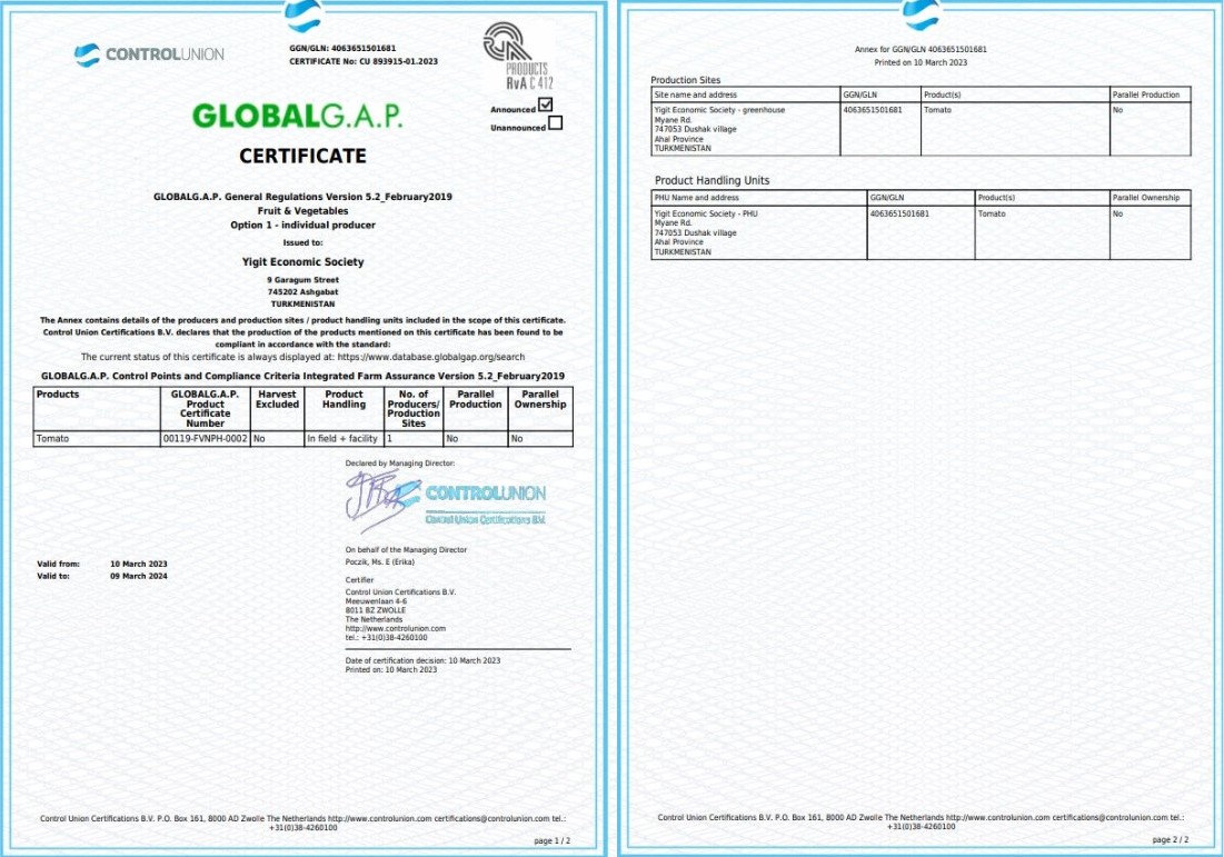 Так, хозяйственное общество Ýigit благодаря сотрудничеству с компанией Standart Hyzmat получило данный сертификат. Став первым и пока единственным в Туркменистане предприятием в сфере сельхозпроизводства и в целом, обладающим сертификатом GLOBALG.A.P.